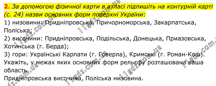 2. За допомогою фізичної карти в атласі підпишіть на контурній карті (с. 24) назви основних форм поверхні України: 1) низовини: Придніпровська, Причорноморська, Закарпатська, Поліська; 2) височини: Придніпровська, Подільська, Донецька, Приазовська, Хотинська (г. Берда); 3) гори: Українські Карпати (г. Говерла), Кримські (г. Роман-Кош). Укажіть, у межах яких основних форм рельєфу розташована ваша область. Придніпровська височина, Поліська низовина.
