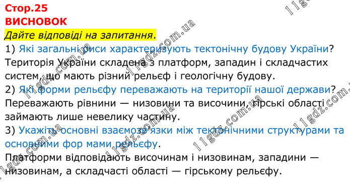 ВИСНОВОК Дайте відповіді на запитання. 1) Які загальні риси характеризують тектонічну будову України? Територія України складена з платформ, западин і складчастих систем, що мають різний рельєф і геологічну будову. 2) Які форми рельєфу переважають на території нашої держави? Переважають рівнини — низовини та височини, гірські області займають лише невелику частину. 3) Укажіть основні взаємозв’язки між тектонічними структурами та основними фор мами рельєфу. Платформи відповідають височинам і низовинам, западини — низовинам, а складчасті області — гірському рельєфу.