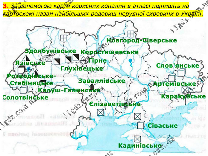 За допомогою карти корисних копалин в атласі підпишіть на картосхемі назви найбільших родовищ нерудної сировини в Україні.