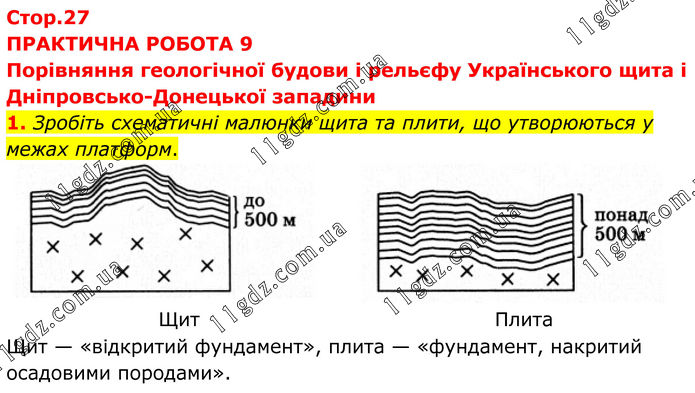 ПРАКТИЧНА РОБОТА 9 Порівняння геологічної будови і рельєфу Українського щита і Дніпровсько-Донецької западини 1. Зробіть схематичні малюнки щита та плити, що утворюються у межах платформ. Щит Плита Щит — «відкритий фундамент», плита — «фундамент, накритий осадовими породами».