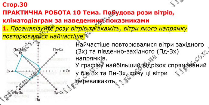 ПРАКТИЧНА РОБОТА 10 Тема. Побудова рози вітрів, кліматодіаграм за наведеними показниками 1. Проаналізуйте розу вітрів та вкажіть, вітри якого напрямку повторювалися найчастіше. Найчастіше повторювалися вітри західного (Зх) та південно-західного (Пд-Зх) напрямків. У графіку найбільший відрізок спрямований у бік Зх та Пн-Зх, тому ці вітри переважають.