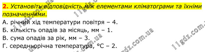2. Установіть відповідність між елементами кліматограми та їхніми позначеннями. А. річний хід температури повітря – 4. Б. кількість опадів за місяць, мм – 1. В. сума опадів за рік, мм – 3. Г. середньорічна температура, °С – 2.