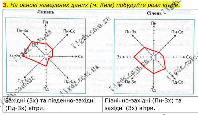 3. На основі наведених даних (м. Київ) побудуйте рози вітрів. Західні (Зх) та південно-західні (Пд-Зх) вітри. Північно-західні (Пн-Зх) та західні (Зх) вітри.