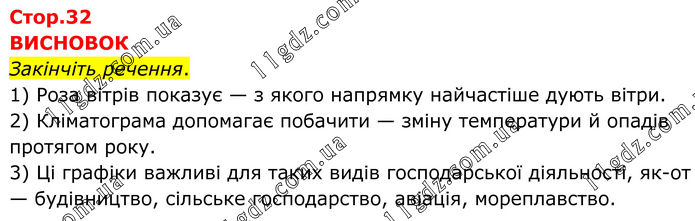 ВИСНОВОК Закінчіть речення. 1) Роза вітрів показує — з якого напрямку найчастіше дують вітри. 2) Кліматограма допомагає побачити — зміну температури й опадів протягом року. 3) Ці графіки важливі для таких видів господарської діяльності, як-от — будівництво, сільське господарство, авіація, мореплавство.