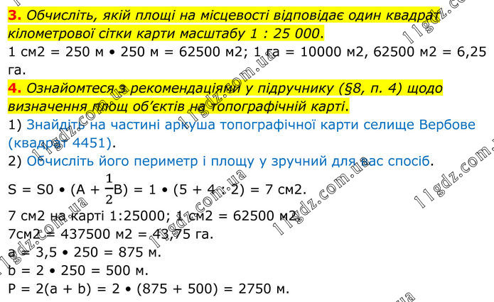 3. Обчисліть, якій площі на місцевості відповідає один квадрат кілометрової сітки карти масштабу 1 : 25 000. 1 см2 = 250 м • 250 м = 62500 м2; 1 га = 10000 м2, 62500 м2 = 6,25 га. 4. Ознайомтеся з рекомендаціями у підручнику (§8, п. 4) щодо визначення площ об’єктів на топографічній карті. 1) Знайдіть на частині аркуша топографічної карти селище Вербове (квадрат 4451). 2) Обчисліть його периметр і площу у зручний для вас спосіб. S = S0 • (А + 1/2В) = 1 • (5 + 4 : 2) = 7 см2. 7 см2 на карті 1:25000; 1 см2 = 62500 м2. 7 см2 = 437500 м2 = 43,75 га. а = 3,5 • 250 = 875 м. b = 2 • 250 = 500 м. Р = 2(а + b) = 2 • (875 + 500) = 2750 м.