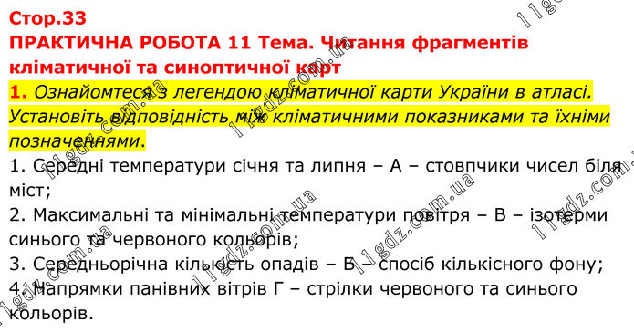 ПРАКТИЧНА РОБОТА 11 Тема. Читання фрагментів кліматичної та синоптичної карт 1. Ознайомтеся з легендою кліматичної карти України в атласі. Установіть відповідність між кліматичними показниками та їхніми позначеннями. 1. Середні температури січня та липня – А – стовпчики чисел біля міст; 2. Максимальні та мінімальні температури повітря – В – ізотерми синього та червоного кольорів; 3. Середньорічна кількість опадів – Б – спосіб кількісного фону; 4. Напрямки панівних вітрів Г – стрілки червоного та синього кольорів.