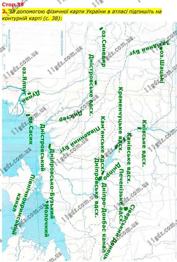 2. За допомогою фізичної карти України в атласі підпишіть на контурній карті (с. 38):