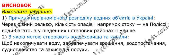 ВИСНОВОК Виконайте завдання. 1) Причини нерівномірного розподілу водних об’єктів в Україні: Через різний рельєф, кількість опадів і напрямок стоку — на Поліссі води багато, а у південних і степових районах її менше. 2) З якою метою створюють водосховища та канали: Щоб накопичувати воду, забезпечувати зрошення, водопостачання, судноплавство та захист від посухи.