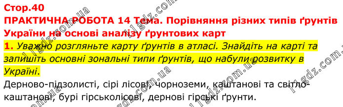ПРАКТИЧНА РОБОТА 14 Тема. Порівняння різних типів ґрунтів України на основі аналізу ґрунтових карт 1. Уважно розгляньте карту ґрунтів в атласі. Знайдіть на карті та запишіть основні зональні типи ґрунтів, що набули розвитку в Україні. Дерново-підзолисті, сірі лісові, чорноземи, каштанові та світло-каштанові, бурі гірськолісові, дернові гірські ґрунти.