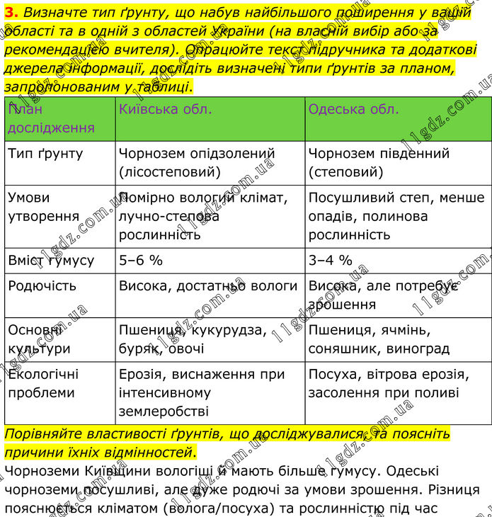3. Визначте тип ґрунту, що набув найбільшого поширення у вашій області та в одній з областей України (на власній вибір або за рекомендацією вчителя). Опрацюйте текст підручника та додаткові джерела інформації, дослідіть визначені типи ґрунтів за планом, запропонованим у таблиці. План дослідження Київська обл. Одеська обл. Тип ґрунту Чорнозем опідзолений (лісостеповий) Чорнозем південний (степовий) Умови утворення Помірно вологий клімат, лучно-степова рослинність Посушливий степ, менше опадів, полинова рослинність Вміст гумусу 5–6 % 3–4 % Родючість Висока, достатньо вологи Висока, але потребує зрошення Основні культури Пшениця, кукурудза, буряк, овочі Пшениця, ячмінь, соняшник, виноград Екологічні проблеми Ерозія, виснаження при інтенсивному землеробстві Посуха, вітрова ерозія, засолення при поливі Порівняйте властивості ґрунтів, що досліджувалися, та поясніть причини їхніх відмінностей. Чорноземи Київщини вологіші й мають більше гумусу. Одеські чорноземи посушливі, але дуже родючі за умови зрошення. Різниця пояснюється кліматом (волога/посуха) та рослинністю під час ґрунтоутворення.