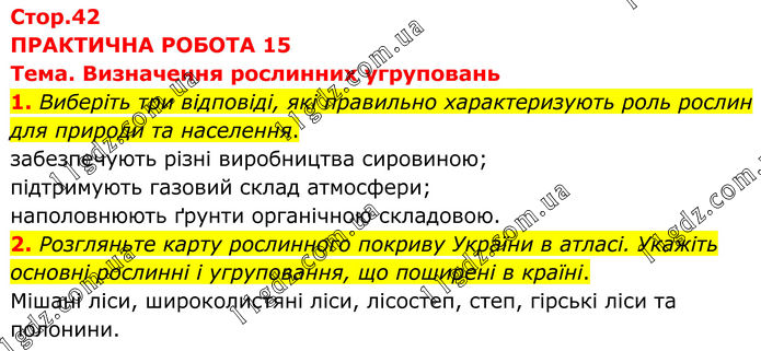 ПРАКТИЧНА РОБОТА 15 Тема. Визначення рослинних угруповань 1. Виберіть три відповіді, які правильно характеризують роль рослин для природи та населення. забезпечують різні виробництва сировиною; підтримують газовий склад атмосфери; наполовнюють ґрунти органічною складовою. 2. Розгляньте карту рослинного покриву України в атласі. Укажіть основні рослинні і угруповання, що поширені в країні. Мішані ліси, широколистяні ліси, лісостеп, степ, гірські ліси та полонини.