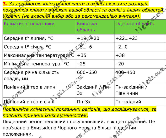 3. За допомогою кліматичної карти в атласі визначте розподіл показників клімату в межах вашої області та однієї з інших областей України (на власний вибір або за рекомендацією вчителя). Кліматичні показники Київська область Одеська область Середня t° липня, °C +19…+20 +22…+23 Середня t° січня, °C –5…–6 –2…0 Максимальна температура, °C +35 +38 Мінімальна температура, °C –25 –20 Середня річна кількість опадів, мм 600–650 400–450 Панівний вітер в липні Західний / Пн-Зх Пн-західний / Північний Панівний вітер в січні Пн-Зх Пн-східний Порівняйте кліматичні показники регіонів, що досліджувалися, та поясніть причини їхніх відмінностей. Південний регіон тепліший і посушливіший, ніж центральний. Це пов’язано з близькістю Чорного моря та більш південним положенням.