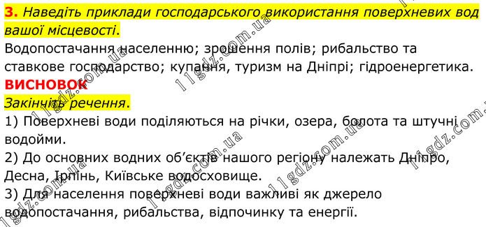 3. Наведіть приклади господарського використання поверхневих вод вашої місцевості. Водопостачання населенню; зрошення полів; рибальство та ставкове господарство; купання, туризм на Дніпрі; гідроенергетика. ВИСНОВОК Закінчіть речення. 1) Поверхневі води поділяються на річки, озера, болота та штучні водойми. 2) До основних водних об’єктів нашого регіону належать Дніпро, Десна, Ірпінь, Київське водосховище. 3) Для населення поверхневі води важливі як джерело водопостачання, рибальства, відпочинку та енергії.