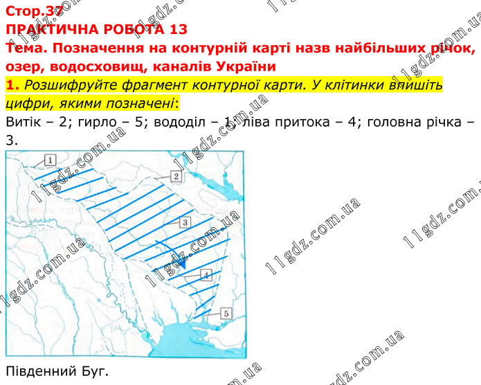 ПРАКТИЧНА РОБОТА 13 Тема. Позначення на контурній карті назв найбільших річок, озер, водосховищ, каналів України 1. Розшифруйте фрагмент контурної карти. У клітинки впишіть цифри, якими позначені: Витік – 2; гирло – 5; вододіл – 1; ліва притока – 4; головна річка – 3. Південний Буг.
