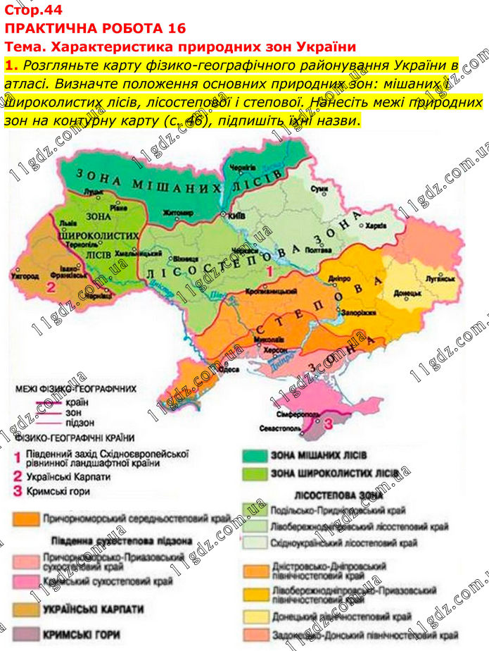 ПРАКТИЧНА РОБОТА 16 Тема. Характеристика природних зон України 1. Розгляньте карту фізико-географічного районування України в атласі. Визначте положення основних природних зон: мішаних і широколистих лісів, лісостепової і степової. Нанесіть межі природних зон на контурну карту (с. 46), підпишіть їхні назви.