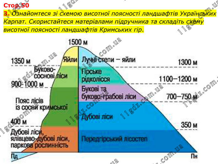 3. Ознайомтеся зі схемою висотної поясності ландшафтів Українських Карпат. Скористайтеся матеріалами підручника та складіть схему висотної поясності ландшафтів Кримських гір.