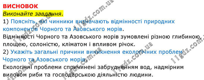 ВИСНОВОК Виконайте завдання. 1) Поясніть, які чинники визначають відмінності природних компонентів Чорного та Азовського морів. Відмінності Чорного та Азовського морів зумовлені різною глибиною, площею, солоністю, кліматом і впливом річок. 2) Укажіть загальні причини виникнення екологічних проблем Чорного та Азовського морів. Екологічні проблеми спричинені забрудненням вод, надмірним виловом риби та господарською діяльністю людини.