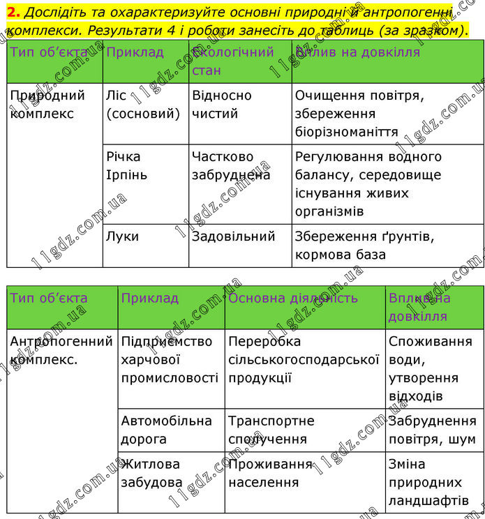 2. Дослідіть та охарактеризуйте основні природні й антропогенні комплекси. Результати 4 і роботи занесіть до таблиць (за зразком). Тип об’єкта Приклад Екологічний стан Вплив на довкілля Природний комплекс Ліс (сосновий) Відносно чистий Очищення повітря, збереження біорізноманіття. Річка Ірпінь Частково забруднена Регулювання водного балансу, середовище існування живих організмів. Луки Задовільний Збереження ґрунтів, кормова база. Тип об’єкта Приклад Основна діяльність Вплив на довкілля Антропогенний комплекс. Підприємство харчової промисловості Переробка сільськогосподарської продукції Споживання води, утворення відходів Автомобільна дорога Транспортне сполучення Забруднення повітря, шум Житлова забудова Проживання населення Зміна природних ландшафтів