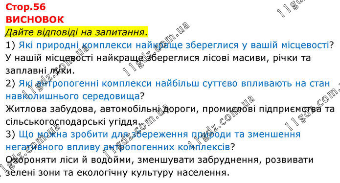 ВИСНОВОК Дайте відповіді на запитання. 1) Які природні комплекси найкраще збереглися у вашій місцевості? У нашій місцевості найкраще збереглися лісові масиви, річки та заплавні луки. 2) Які антропогенні комплекси найбільш суттєво впливають на стан навколишнього середовища? Житлова забудова, автомобільні дороги, промислові підприємства та сільськогосподарські угіддя. 3) Що можна зробити для збереження природи та зменшення негативного впливу антропогенних комплексів? Охороняти ліси й водойми, зменшувати забруднення, розвивати зелені зони та екологічну культуру населення.