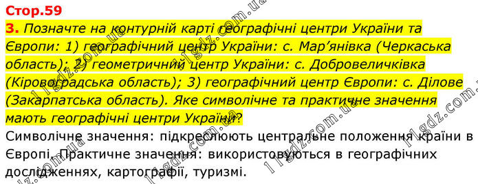 3. Позначте на контурній карті географічні центри України та Європи: 1) географічний центр України: с. Мар’янівка (Черкаська область); 2) геометричний центр України: с. Добровеличківка (Кіровоградська область); 3) географічний центр Європи: с. Ділове (Закарпатська область). Яке символічне та практичне значення мають географічні центри України? Символічне значення: підкреслюють центральне положення країни в Європі. Практичне значення: використовуються в географічних дослідженнях, картографії, туризмі.