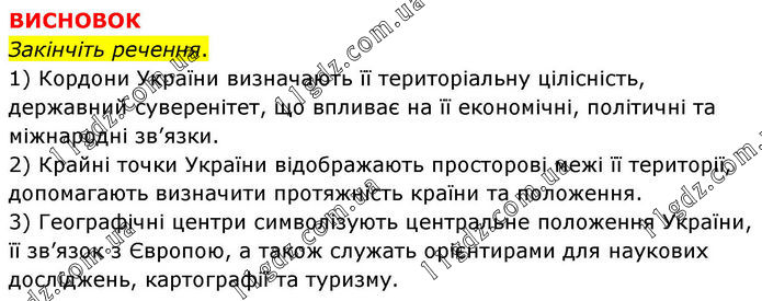 ВИСНОВОК Закінчіть речення. 1) Кордони України визначають її територіальну цілісність, державний суверенітет, що впливає на її економічні, політичні та міжнародні зв’язки. 2) Крайні точки України відображають просторові межі її території, допомагають визначити протяжність країни та положення. 3) Географічні центри символізують центральне положення України, її зв’язок з Європою, а також служать орієнтирами для наукових досліджень, картографії та туризму.