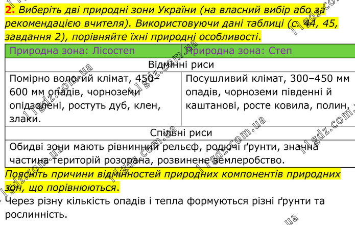2. Виберіть дві природні зони України (на власний вибір або за рекомендацією вчителя). Використовуючи дані таблиці (с. 44, 45, завдання 2), порівняйте їхні природні особливості. Природна зона: Лісостеп Природна зона: Степ Відмінні риси Помірно вологий клімат, 450–600 мм опадів, чорноземи опідзолені, ростуть дуб, клен, злаки. Посушливий клімат, 300–450 мм опадів, чорноземи південні й каштанові, росте ковила, полин. Спільні риси Обидві зони мають рівнинний рельєф, родючі ґрунти, значна частина територій розорана, розвинене землеробство. Поясніть причини відмінностей природних компонентів природних зон, що порівнюються. Через різну кількість опадів і тепла формуються різні ґрунти та рослинність.
