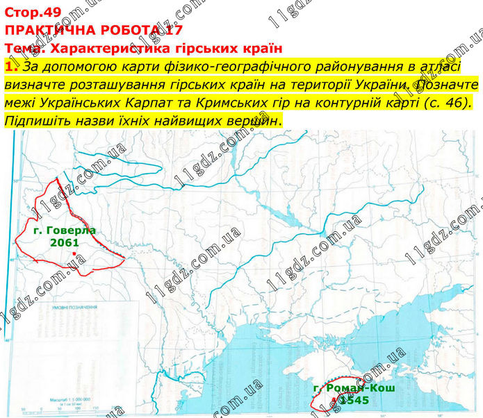 ПРАКТИЧНА РОБОТА 17 Тема. Характеристика гірських країн 1. За допомогою карти фізико-географічного районування в атласі визначте розташування гірських країн на території України. Позначте межі Українських Карпат та Кримських гір на контурній карті (с. 46). Підпишіть назви їхніх найвищих вершин.