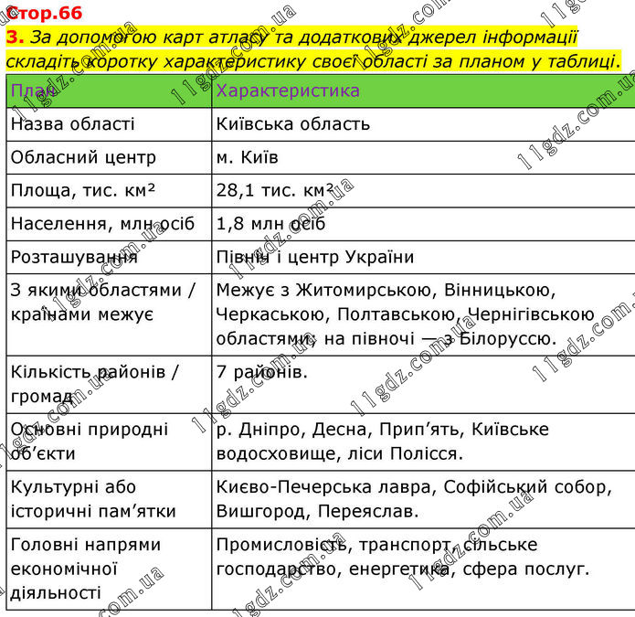 3. За допомогою карт атласу та додаткових джерел інформації складіть коротку характеристику своєї області за планом у таблиці. План Характеристика Назва області Київська область Обласний центр м. Київ Площа, тис. км² 28,1 тис. км² Населення, млн осіб 1,8 млн осіб Розташування Північ і центр України З якими областями / країнами межує Межує з Житомирською, Вінницькою, Черкаською, Полтавською, Чернігівською областями; на півночі — з Білоруссю. Кількість районів / громад 7 районів. Основні природні об’єкти р. Дніпро, Десна, Прип’ять, Київське водосховище, ліси Полісся. Культурні або історичні пам’ятки Києво-Печерська лавра, Софійський собор, Вишгород, Переяслав. Головні напрями економічної діяльності Промисловість, транспорт, сільське господарство, енергетика, сфера послуг.