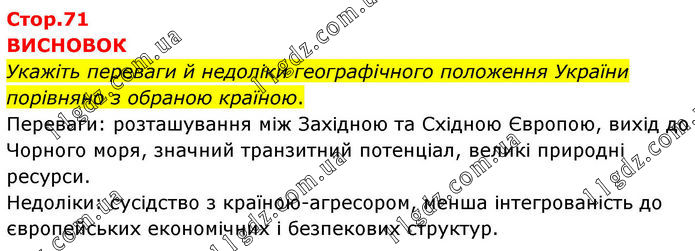 ВИСНОВОК Укажіть переваги й недоліки географічного положення України порівняно з обраною країною. Переваги: розташування між Західною та Східною Європою, вихід до Чорного моря, значний транзитний потенціал, великі природні ресурси. Недоліки: сусідство з країною-агресором, менша інтегрованість до європейських економічних і безпекових структур.