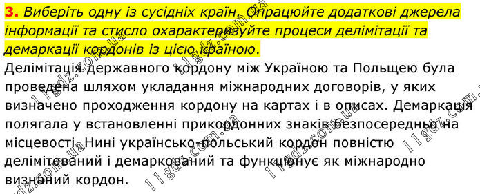 3. Виберіть одну із сусідніх країн. Опрацюйте додаткові джерела інформації та стисло охарактеризуйте процеси делімітації та демаркації кордонів із цією країною. Делімітація державного кордону між Україною та Польщею була проведена шляхом укладання міжнародних договорів, у яких визначено проходження кордону на картах і в описах. Демаркація полягала у встановленні прикордонних знаків безпосередньо на місцевості. Нині українсько-польський кордон повністю делімітований і демаркований та функціонує як міжнародно визнаний кордон.