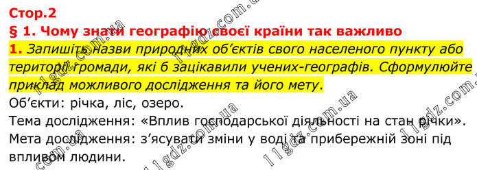 § 1. Чому знати географію своєї країни так важливо 1. Запишіть назви природних об’єктів свого населеного пункту або території громади, які б зацікавили учених-географів. Сформулюйте приклад можливого дослідження та його мету. Об’єкти: річка, ліс, озеро. Тема дослідження: «Вплив господарської діяльності на стан річки». Мета дослідження: з’ясувати зміни у воді та прибережній зоні під впливом людини.
