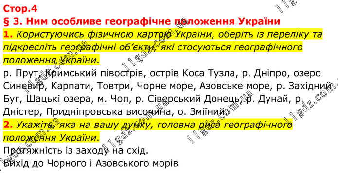§ 3. Ним особливе географічне положення України 1. Користуючись фізичною картою України, оберіть із переліку та підкресліть географічні об’єкти, які стосуються географічного положення України. р. Прут, Кримський півострів, острів Коса Тузла, р. Дніпро, озеро Синевир, Карпати, Товтри, Чорне море, Азовське море, р. Західний Буг, Шацькі озера, м. Чоп, р. Сіверський Донець, р. Дунай, р. Дністер, Придніпровська височина, о. Зміїний. 2. Укажіть, яка на вашу думку, головна риса географічного положення України. Протяжність із заходу на схід. Вихід до Чорного і Азовського морів.