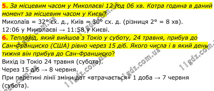 5. За місцевим часом у Миколаєві 12 год 06 хв. Котра година в даний момент за місцевим часом у Києві? Миколаїв = 32° сх. д., Київ = 30° сх. д. (різниця 2° = 8 хв). 12:06 у Миколаєві → 11:58 у Києві. 6. Теплохід, який вийшов з Токіо у суботу, 24 травня, прибув до Сан-Франциско (США) рівно через 15 діб. Якого числа і в який день тижня він прибув до Сан-Франциско? Вихід із Токіо 24 травня (субота). Через 15 діб → 8 червня. При перетині лінії зміни дат «втрачається» 1 доба → 7 червня (субота).