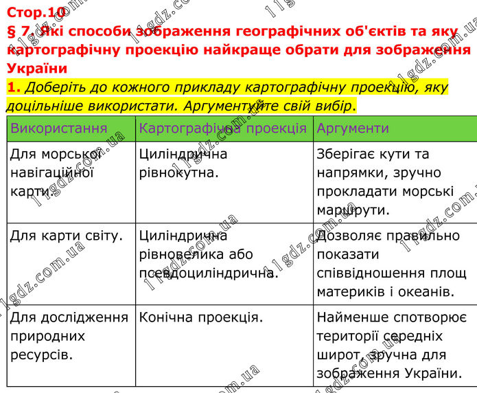§ 7. Які способи зображення географічних об'єктів та яку картографічну проекцію найкраще обрати для зображення України 1. Доберіть до кожного прикладу картографічну проекцію, яку доцільніше використати. Аргументуйте свій вибір. Використання Картографічна проекція Аргументи Для морської навігаційної карти. Циліндрична рівнокутна. Зберігає кути та напрямки, зручно прокладати морські маршрути. Для карти світу. Циліндрична рівновелика або псевдоциліндрична. Дозволяє правильно показати співвідношення площ материків і океанів. Для дослідження природних ресурсів. Конічна проекція. Найменше спотворює території середніх широт, зручна для зображення України.