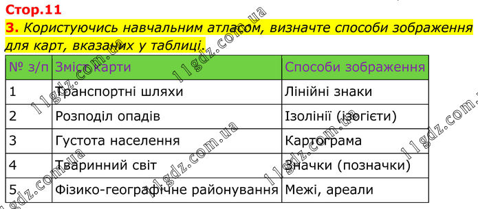 3. Користуючись навчальним атласом, визначте способи зображення для карт, вказаних у таблиці. № з/п Зміст карти Способи зображення 1 Транспортні шляхи Лінійні знаки 2 Розподіл опадів Ізолінії (ізогієти) 3 Густота населення Картограма 4 Тваринний світ Значки (позначки) 5 Фізико-географічне районування Межі, ареали