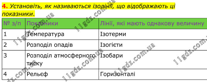 4. Установіть, як називаються ізолінії, що відображають ці показники. № з/п Показники Лінії, які мають однакову величину 1 Температура Ізотерми 2 Розподіл опадів Ізогієти 3 Розподіл атмосферного тиску Ізобари 4 Рельєф Горизонталі