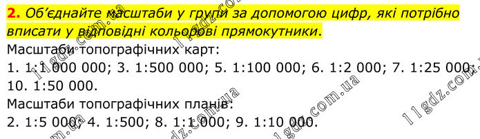 2. Об’єднайте масштаби у групи за допомогою цифр, які потрібно вписати у відповідні кольорові прямокутники. Масштаби топографічних карт: 1. 1:1 000 000; 3. 1:500 000; 5. 1:100 000; 6. 1:2 000; 7. 1:25 000; 10. 1:50 000. Масштаби топографічних планів: 2. 1:5 000; 4. 1:500; 8. 1:1 000; 9. 1:10 000.