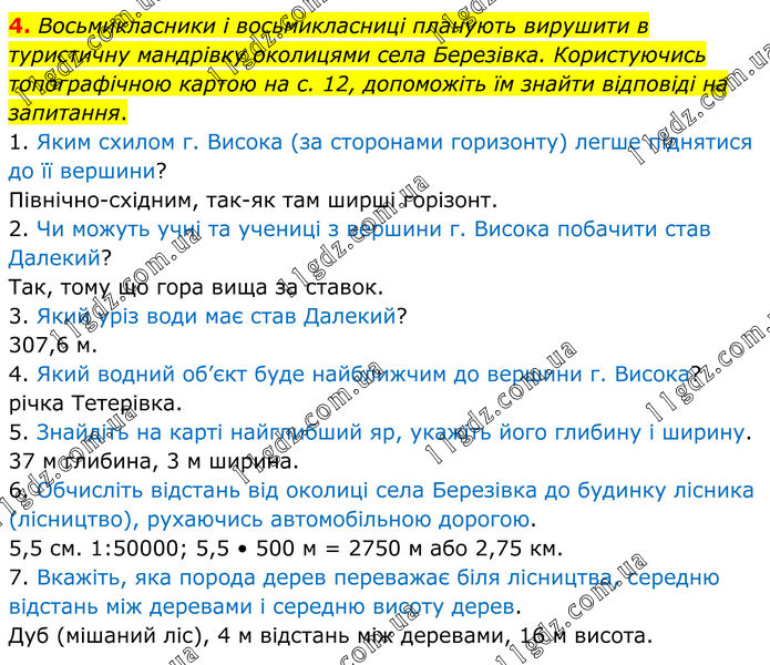 4. Восьмикласники і восьмикласниці планують вирушити в туристичну мандрівку околицями села Березівка. Користуючись топографічною картою на с. 12, допоможіть їм знайти відповіді на запитання. 1. Яким схилом г. Висока (за сторонами горизонту) легше піднятися до її вершини? Північно-східним, так-як там ширші горізонт. 2. Чи можуть учні та учениці з вершини г. Висока побачити став Далекий? Так, тому що гора вища за ставок. 3. Який уріз води має став Далекий? 307,6 м. 4. Який водний об’єкт буде найближчим до вершини г. Висока? річка Тетерівка. 5. Знайдіть на карті найглибший яр, укажіть його глибину і ширину. 37 м глибина, 3 м ширина. 6. Обчисліть відстань від околиці села Березівка до будинку лісника (лісництво), рухаючись автомобільною дорогою. 5,5 см. 1:50000; 5,5 • 500 м = 2750 м або 2,75 км. 7. Вкажіть, яка порода дерев переважає біля лісництва, середню відстань між деревами і середню висоту дерев. Дуб (мішаний ліс), 4 м відстань між деревами, 16 м висота.