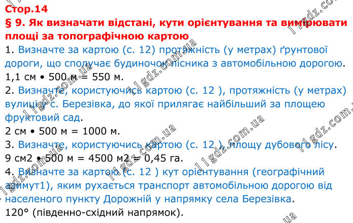 § 9. Як визначати відстані, кути орієнтування та вимірювати площі за топографічною картою 1. Визначте за картою (с. 12) протяжність (у метрах) ґрунтової дороги, що сполучає будиночок лісника з автомобільною дорогою. 1,1 см • 500 м = 550 м. 2. Визначте, користуючись картою (с. 12 ), протяжність (у метрах) вулиці у с. Березівка, до якої прилягає найбільший за площею фруктовий сад. 2 см • 500 м = 1000 м. 3. Визначте, користуючись картою (с. 12 ), площу дубового лісу. 9 см2 • 500 м = 4500 м2 = 0,45 га. 4. Визначте за картою (с. 12 ) кут орієнтування (географічний азимут), яким рухається транспорт автомобільною дорогою від населеного пункту Дорожній у напрямку села Березівка. 120° (південно-східний напрямок).