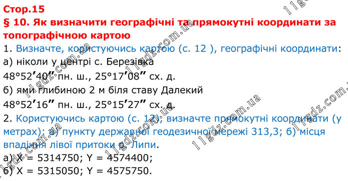 § 10. Як визначити географічні та прямокутні координати за топографічною картою 1. Визначте, користуючись картою (с. 12 ), географічні координати: а) ніколи у центрі с. Березівка 48°52’40” пн. ш., 25°17’08” сх. д. б) ями глибиною 2 м біля ставу Далекий 48°52’16” пн. ш., 25°15’27” сх. д. 2. Користуючись картою (с. 12), визначте прямокутні координати (у метрах): а) пункту державної геодезичної мережі 313,3; б) місця впадіння лівої притоки р. Липи. а) Х = 5314750; Y = 4574400; б) X = 5315050; Y = 4575750.