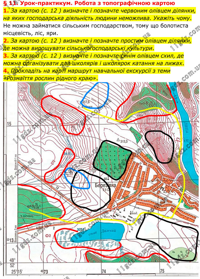 § 11. Урок-практикум. Робота з топографічною картою 1. За картою (с. 12 ) визначте і позначте червоним олівцем ділянки, на яких господарська діяльність людини неможлива. Укажіть чому. Не можна займатися сільським господарством, тому що болотиста місцевість, ліс, яри. 2. За картою (с. 12 ) визначте і позначте простим олівцем ділянки, де можна вирощувати сільськогосподарські культури. 3. За картою (с. 12 ) визначте і позначте синім олівцем схил, де можна організувати для школярів і школярок катання на лижах. 4. Прокладіть на карті маршрут навчальної екскурсії з теми «Розмаїття рослин рідного краю».