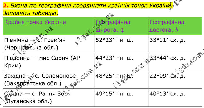 2. Визначте географічні координати крайніх точок України. Заповніть таблицю. Крайня точка України Географічна широта, φ Географічна довгота, λ Північна — с. Грем’яч (Чернігівська обл.) 52°23′ пн. ш. 33°11′ сх. д. Південна — мис Сарич (АР Крим) 44°23′ пн. ш. 33°44′ сх. д. Західна — с. Соломонове (Закарпатська обл.) 48°25′ пн. ш. 22°09′ сх. д. Східна — с. Рання Зоря (Луганська обл.) 49°15′ пн. ш. 40°13′ сх. д.