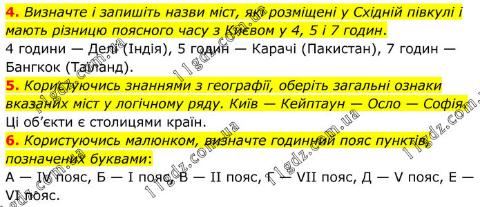 4. Визначте і запишіть назви міст, які розміщені у Східній півкулі і мають різницю поясного часу з Києвом у 4, 5 і 7 годин. 4 години — Делі (Індія), 5 годин — Карачі (Пакистан), 7 годин — Бангкок (Таїланд). 5. Користуючись знаннями з географії, оберіть загальні ознаки вказаних міст у логічному ряду. Київ — Кейптаун — Осло — Софія. Ці об’єкти є столицями країн. 6. Користуючись малюнком, визначте годинний пояс пунктів, позначених буквами: А — IV пояс, Б — І пояс, В — II пояс, Г — VII пояс, Д — V пояс, Е — VI пояс.