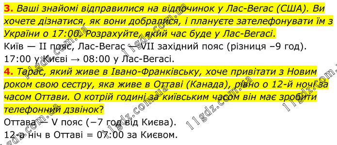 3. Ваші знайомі відправилися на відпочинок у Лас-Вегас (США). Ви хочете дізнатися, як вони добралися, і плануєте зателефонувати їм з України о 17:00. Розрахуйте, який час буде у Лас-Вегасі. Київ — II пояс, Лас-Вегас — VII західний пояс (різниця –9 год). 17:00 у Києві → 08:00 у Лас-Вегасі. 4. Тарас, який живе в Івано-Франківську, хоче привітати з Новим роком свою сестру, яка живе в Оттаві (Канада), рівно о 12-й ночі за часом Оттави. O котрій годині за київським часом він має зробити телефонний дзвінок? Оттава — V пояс (−7 год від Києва). 12-а ніч в Оттаві = 07:00 за Києвом.