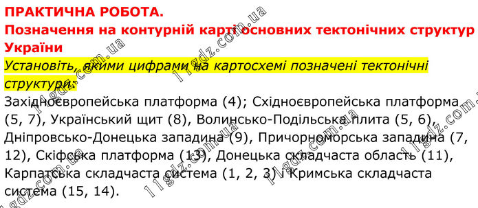 ПРАКТИЧНА РОБОТА. Позначення на контурній карті основних тектонічних структур України Установіть, якими цифрами на картосхемі позначені тектонічні структури: Західноєвропейська платформа (4); Східноєвропейська платформа (5, 7), Український щит (8), Волинсько-Подільська плита (5, 6), Дніпровсько-Донецька западина (9), Причорноморська западина (7, 12), Скіфська платформа (13), Донецька складчаста область (11), Карпатська складчаста система (1, 2, 3) і Кримська складчаста система (15, 14).