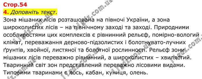4. Доповніть текст. Зона мішаних лісів розташована на півночі України, а зона широколистих лісів – на північному заході та заході. Природними особливостями цих комплексів є рівнинний рельєф, помірно-вологий клімат, переважання дерново-підзолистих і болотнувато-лучних ґрунтів, хвойної, листяної та болотної рослинності. Рельєф зони мішаних лісів переважно рівнинний, а широколистих – хвилястий. Тваринний світ зон представлений переважно лісовими видами. Типовими тваринами є лось, кабан, куниця, олень.