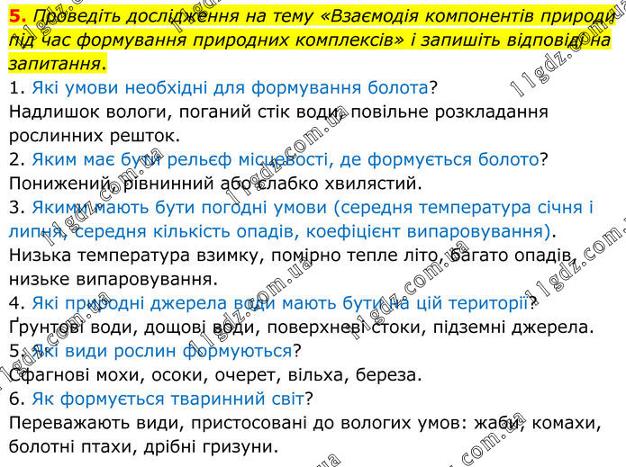 5. Проведіть дослідження на тему «Взаємодія компонентів природи під час формування природних комплексів» і запишіть відповіді на запитання. 1. Які умови необхідні для формування болота? Надлишок вологи, поганий стік води, повільне розкладання рослинних решток. 2. Яким має бути рельєф місцевості, де формується болото? Понижений, рівнинний або слабко хвилястий. 3. Якими мають бути погодні умови (середня температура січня і липня, середня кількість опадів, коефіцієнт випаровування). Низька температура взимку, помірно тепле літо, багато опадів, низьке випаровування. 4. Які природні джерела води мають бути на цій території? Ґрунтові води, дощові води, поверхневі стоки, підземні джерела. 5. Які види рослин формуються? Сфагнові мохи, осоки, очерет, вільха, береза. 6. Як формується тваринний світ? Переважають види, пристосовані до вологих умов: жаби, комахи, болотні птахи, дрібні гризуни.
