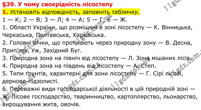 §39. У чому своєрідність лісостепу 1. Установіть відповідність, заповніть табличку. 1 — К; 2 — В; 3 — Л; 4 — А; 5 — Г; 6 — Ж. 1. Області України, що розміщені в зоні лісостепу — К. Вінницька, Черкаська, Полтавська, Харківська. 2. Головні річки, що протікають через природну зону — В. Десна, Прип’ять, Уж, Західний Буг. 3. Природна зона на північ від лісостепу — Л. Зона мішаних лісів. 4. Природна зона на південь від лісостепу — А. Степ. 5. Типи ґрунтів, характерні для зони лісостепу — Г. Сірі лісові, дерново-підзолисті. 6. Переважні види господарської діяльності в цій природній зоні — Ж. Лісове господарство, тваринництво, картоплярство, льонарство, вирощування жита, овочів.