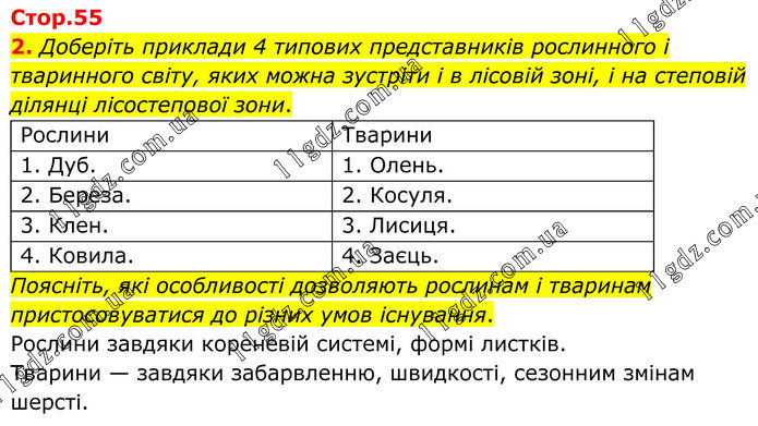 2. Доберіть приклади 4 типових представників рослинного і тваринного світу, яких можна зустріти і в лісовій зоні, і на степовій ділянці лісостепової зони. Рослини Тварини 1. Дуб. 1. Олень. 2. Береза. 2. Косуля. 3. Клен. 3. Лисиця. 4. Ковила. 4. Заєць. Поясніть, які особливості дозволяють рослинам і тваринам пристосовуватися до різних умов існування. Рослини завдяки кореневій системі, формі листків. Тварини — завдяки забарвленню, швидкості, сезонним змінам шерсті.