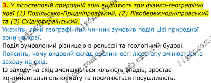 3. У лісостеповій природній зоні виділяють три фізико-географічні краї (1) Подільсько-Придніпровський, (2) Лівобережнодніпровський та (3) Східноукраїнський. Укажіть, який географічний чинник зумовив поділ цієї природної зони на краї. Поділ зумовлений різницею в рельєфі та геологічній будові. Поясніть, чому видовий склад рослинності лісостепу змінюється із заходу на схід. Із заходу на схід зменшуються кількість опадів, зростає континентальність клімату та посилюється посушливість.